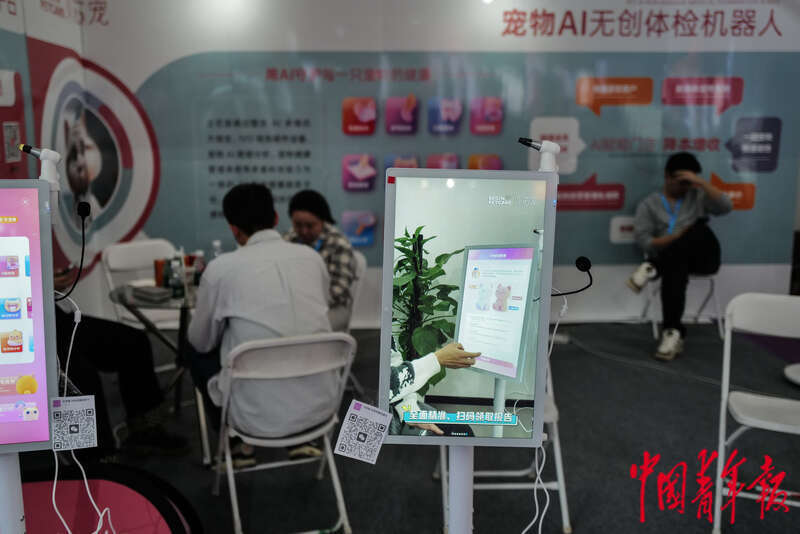 3月1日,北京中国国际展览中心(顺义馆),第12届北京国际宠物用品展,一家展商展出的宠物AI无创体检相关产品。据了解,日前有宠物服务行业头部企业宠物家宣布,将依托全国最大的宠物档案库及500万条护理服务数据沉淀,接入AI大模型。 中青报·中青网记者 赵迪/摄