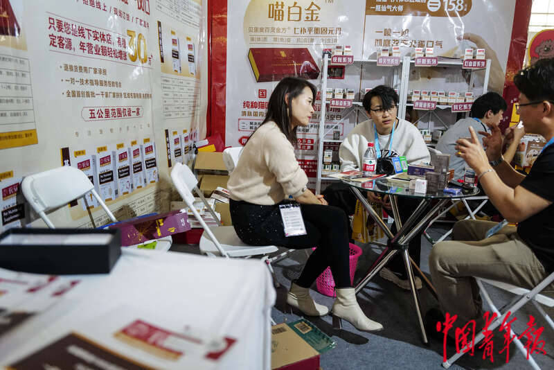 3月1日,北京中国国际展览中心(顺义馆),第12届北京国际宠物用品展一家宠物中药展台,几名展商正在沟通。 中青报·中青网记者 赵迪/摄