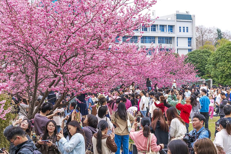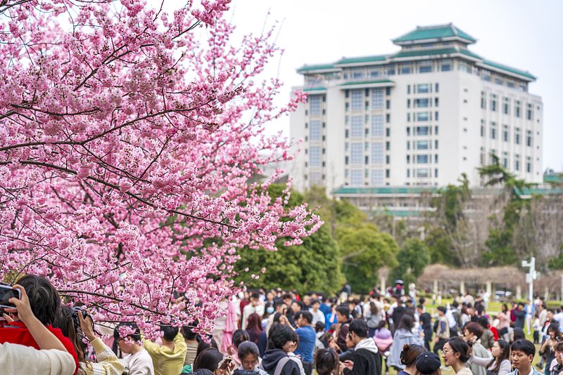 2025年3月1日,武汉大学的早樱已经部分盛开,漂亮粉色的樱花吸引了大量游客前来拍照。