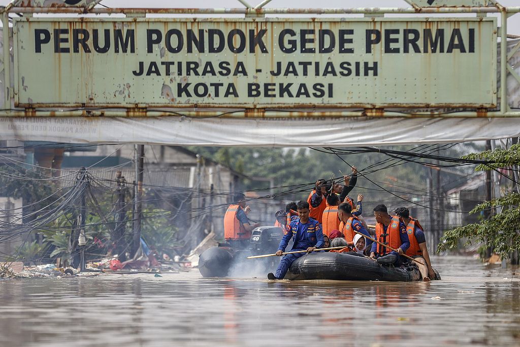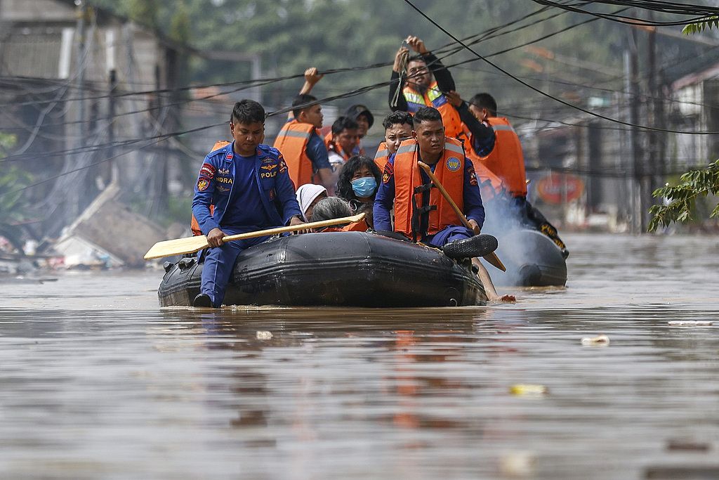 当地时间2025年3月4日,印尼雅加达帕萨尔明戈区,该地区被洪水淹没,居民正在被紧急撤离至更高的地方。