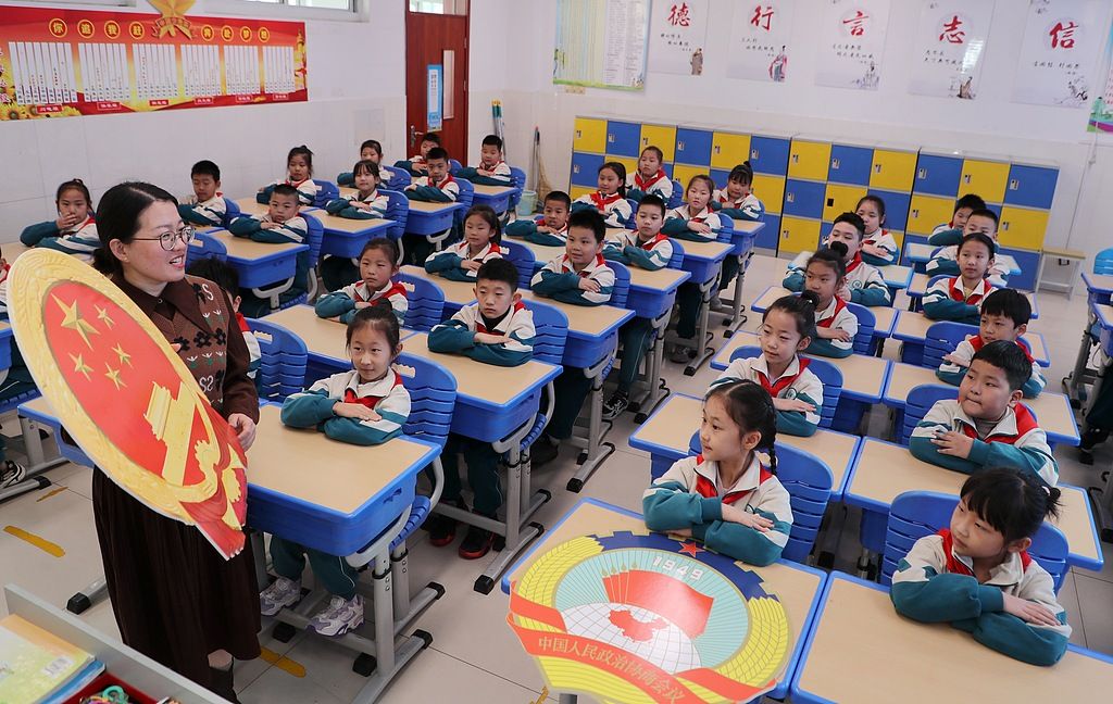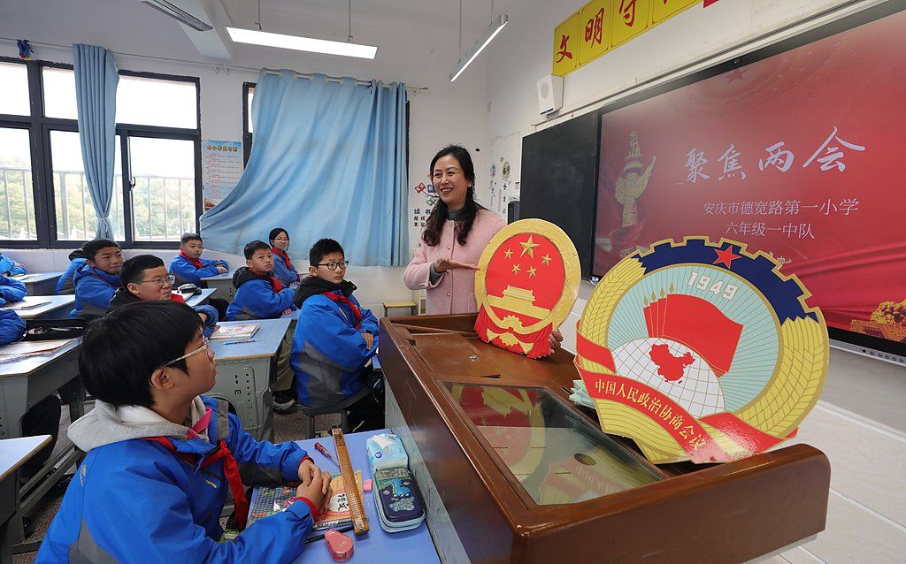 2025年3月5日,山东东营,弘文小学三年级四班,教师给学生讲解两会知识。