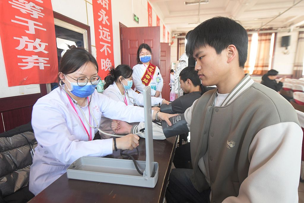 2024年3月6日,河北省石家庄新乐市医院体检中心,新乐市第二中学高三学生正在进行体检。