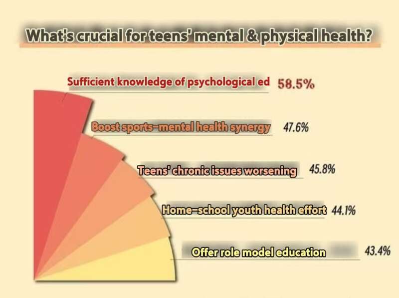 A recent survey by China Youth Daily and wenjuan.com, involving 2,007 respondents, revealed that 47.6% of participants advocate for better integration of sports and mental health education for teenagers. Additionally, 52.1% emphasized the need for comprehensive family education improvements to enhance parenting skills. Concerns include rising obesity rates, insufficient physical activity, and mental health challenges among youth. Respondents also highlighted poor parent-child communication and inadequate collaboration between schools and families. Experts suggest strengthening sports programs, community support, and professional psychological counseling to promote holistic youth development.