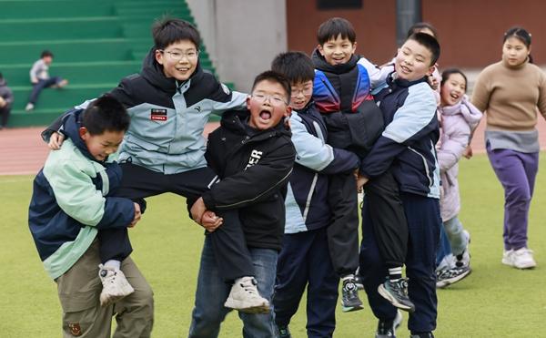 2月25日,江苏淮安生态文旅区沁春路小学,小学生在大课间玩“抬花轿”游戏。视觉中国供图