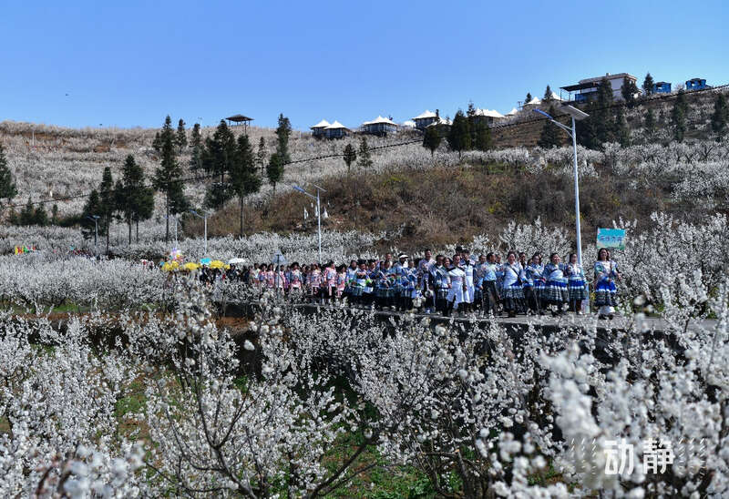 春光灿烂,毕节市纳雍县厍东关乡以陶营村为核心的万亩樱花如期绽放。雪白的花瓣在枝头摇曳,花香四溢,吸引了众多游客前来观赏。