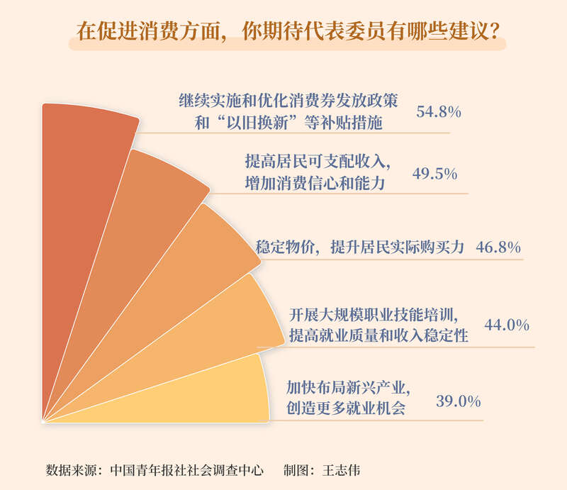 电子产品“国补”上线,国潮产品持续“出圈”,如今,消费市场越来越火热。在今年的全国两会上,消费也是代表委员热议的高频词。大家期待哪些促进消费的“给力”举措?全国两会前夕,中国青年报社社会调查中心联合问卷网(wenjuan.com)实施的一项有2007人参与的两会调查显示,54.8%的受访者希望继续实施和优化消费券发放政策和“以旧换新”等补贴措施,49.5%的受访者希望提高居民可支配收入,增加消费信心和能力,46.8%的受访者希望稳定物价,提升居民实际购买力。
