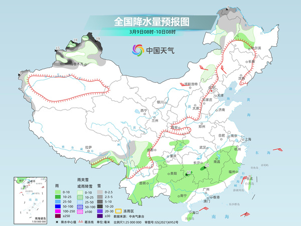 今明两天,随着暖湿气流增强,南方又将迎来一次降水过程,并且11日起,随着后一股实力较强的冷空气南下,配合暖湿气流,南方雨势将开始增强,江南中到大雨开始增多。此外,今天的新疆北部,后天的内蒙古东北部、黑龙江等地还将出现强降雪,局地或有大到暴雪或大暴雪。