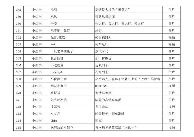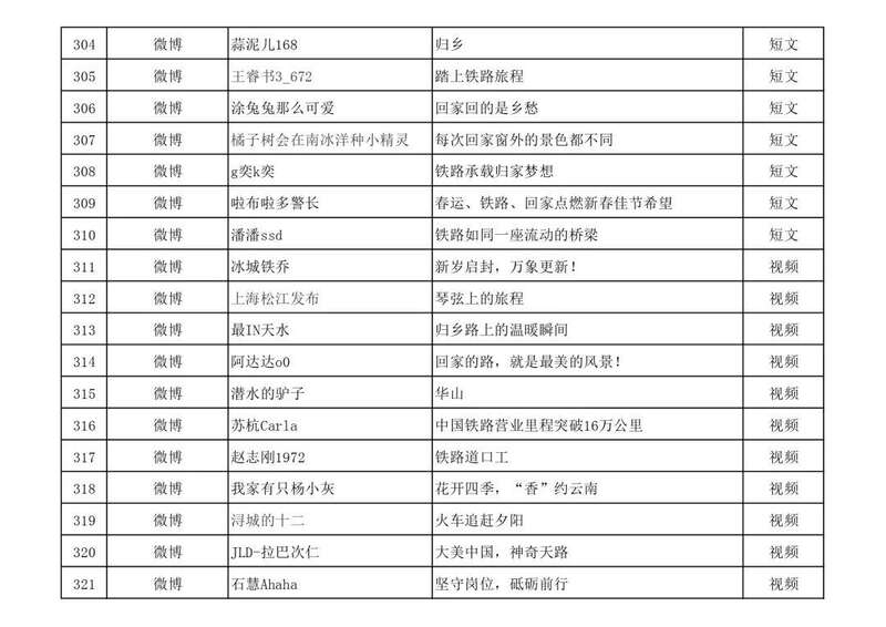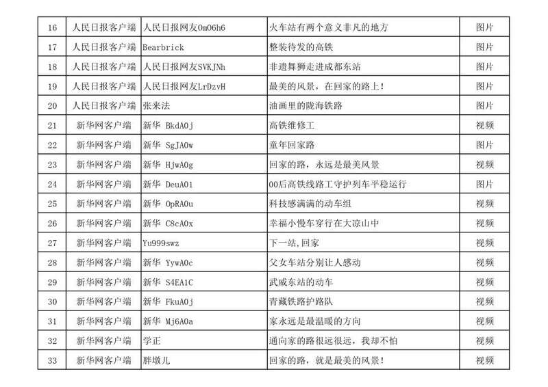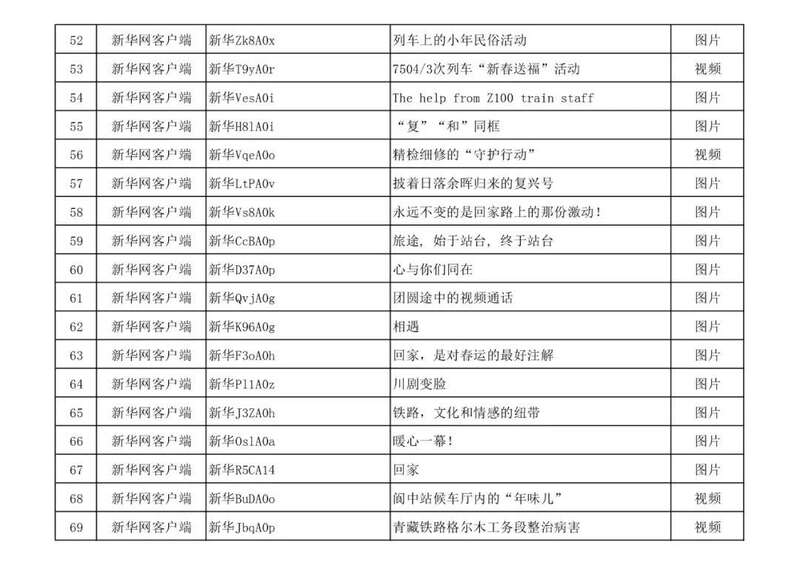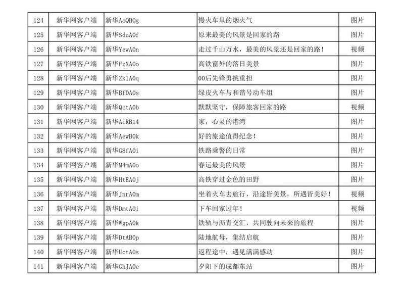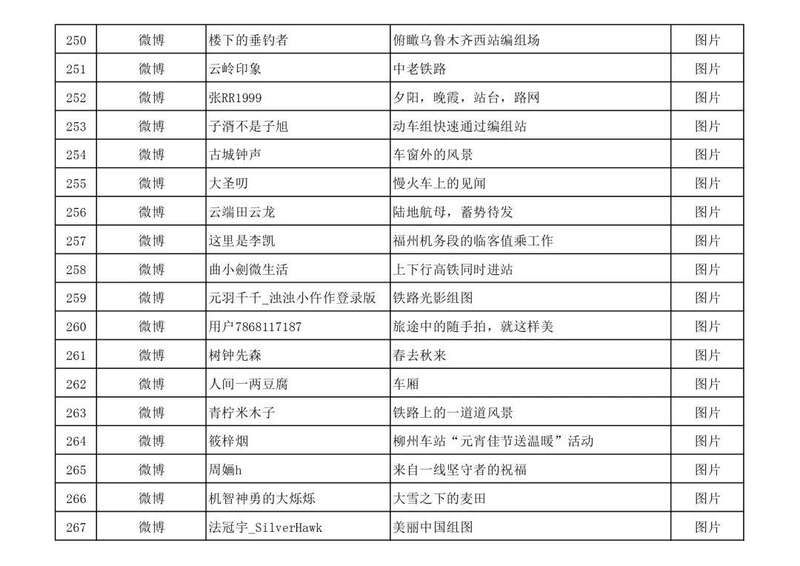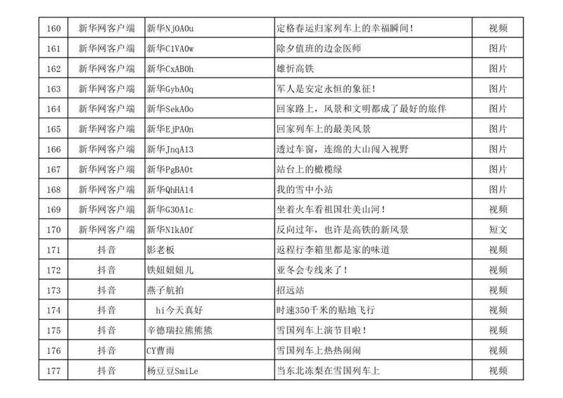 3月13日,由中宣部文明创建局、中央网信办网络传播局、中国国家铁路集团有限公司党组宣传部联合举办的“我的铁路风景”主题宣传首季活动优秀作品,在人民日报客户端、新华网、中国文明网、人民铁道网、中国国家铁路集团有限公司官方网站等平台公布,共410件,其中图片245个(组)、短视频131个、短文34篇。