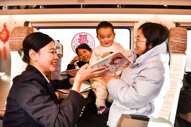 网友“云端田云龙”拍摄动车所“陆地航母”蓄势待发的绝美光影,体现了大国重器的视觉震撼;不少网友晒出在车站写福字、看非遗、闹元宵的场景,表达了中国人奔赴团圆的喜悦心情;网友“平安”抓拍到车厢里一名高铁乘务员蹲下身将哭闹孩子揽入怀中安抚的瞬间,让大家感叹“旅途中不仅有速度,更有温情和关爱”;网民“拉巴次仁”写道,火车行驶在“世界屋脊”青藏高原上,快速抓拍飞过的雪山、草原、冰川,展现了大美中国的风光。