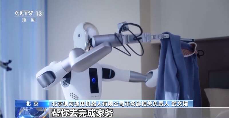 北京银河通用机器人有限公司市场部相关负责人 武文韬:我们将具身大模型的能力赋能到了机器人的身体里面,帮助它既可以理解人类指令,也可以在各种场景下完成各种各样的任务,具备通用机器人的能力。比如它可以在商超里面去执行取货,工厂里面去做料箱的搬运、分拣;家庭里面还可以去叠衣服、清理垃圾、清理杂物,完成家务。