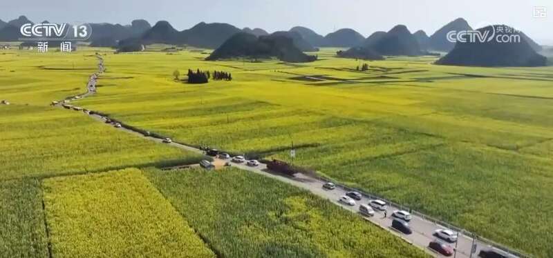 在罗平县,万亩油菜花田像一块块金色的绒毯在地面铺开。群山、村落相互映衬,列车从田边驶过,一幅春意盎然的乡村画卷映入眼帘。游客们从各地赶来,领略油菜花的美丽。