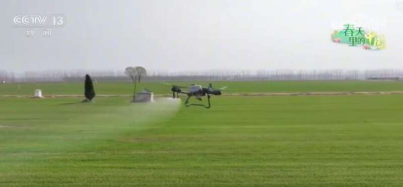 而在另一处麦田里,植保无人机正在喷洒防治病虫害的药物。飞手们操纵控制器圈画出相应范围,植保无人机便能自动设计路线,精准高效完成喷洒任务,1天就能喷洒700多亩麦田。