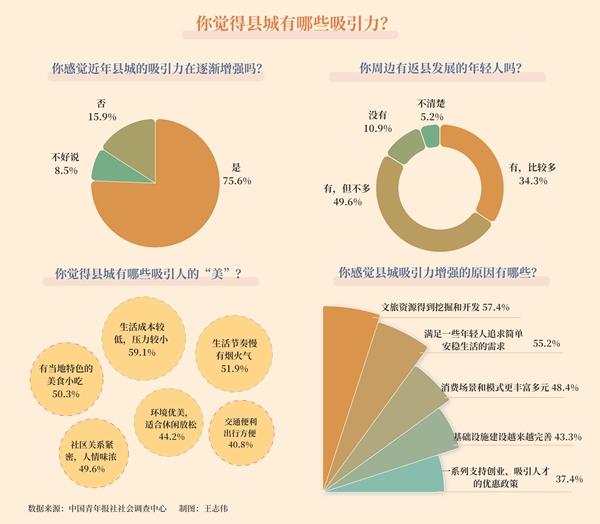 去哪儿发展是不少人会面临的选择。如今,随着交通网络和基础设施越来越完善,“不起眼”的小县城收获了越来越多年轻人的关注和青睐。近日,中国青年报社社会调查中心联合问卷网(wenjuan.com)发布的一项有1337名受访者参与的调查显示,75.6%的受访者感觉近年县城的吸引力逐渐增强。对于县城的吸引力,59.1%的受访者认为是生活成本较低,压力较小,51.9%的受访者觉得是生活节奏慢,有烟火气。