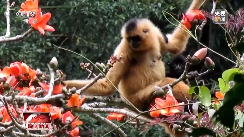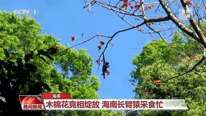 近日,海南热带雨林国家公园霸王岭片区的木棉花竞相绽放,为海南长臂猿提供了丰富的食物来源。海南长臂猿监测队员用镜头记录下了他们采食木棉花的珍贵画面。一只全身乌黑的雄性海南长臂猿正悬挂在树枝上,熟练地采摘木棉花。