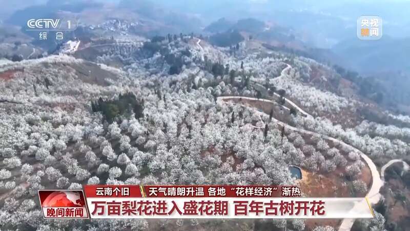 眼下,云南红河哈尼族彝族自治州个旧市加级寨的1.4万亩梨花盛开,雪白的梨花绽放枝头,白色花海随山势波浪起伏,游客漫步其间,仿佛置身于浪漫的梨花雨中。加级寨种植梨树已经有200多年的历史,上百年的古梨树就有1000多棵。