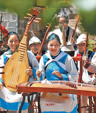 丽江纳西族村民在演奏纳西古乐。 赵庆祖摄(人民视觉)