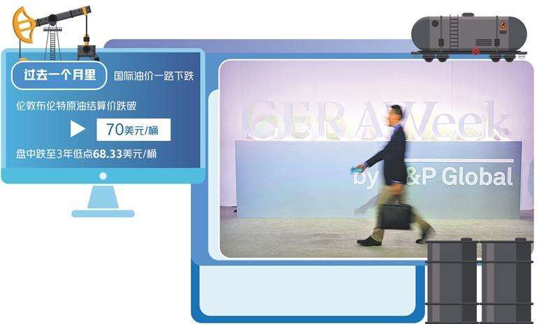 先看最近国际油价的走势。一方面是油价随着美国的关税战威胁而剧烈波动,并且跌到半年来的最低点。统计数据表明,在过去一个月里,国际油价一路下跌,伦敦布伦特原油期货结算价跌破70美元/桶,盘中更是跌至3年低点68.33美元/桶。自特朗普就职以来,国际油价每桶平均价格已经下跌了10美元之多。