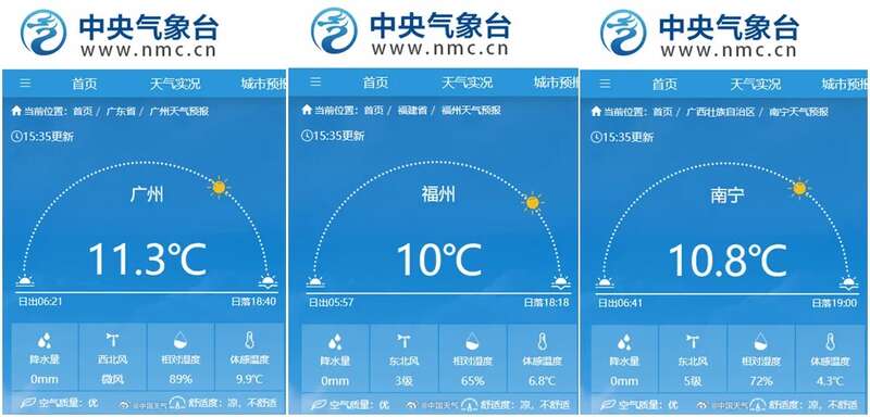 今天下午15时左右气温实况看,除了云南和海南岛,长江以南大部分地区气温都跌至10℃出头,甚至只有个位数。长沙4.6℃、杭州6.5℃、贵阳3.4℃,冷如三九四九!而南宁10.8℃、广州11.3℃也仿佛在piapia打常年无冬气候区的“脸”……