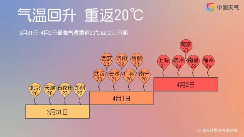 展望下周,气温将在波动中逐渐回升。到清明节前后,华北平原多地最高气温接近或超过25°C,南方大部气温也将重返20℃,部分地区超25℃,像长沙今天气温不足10℃,到4月3日最高气温可达25℃左右,累计升温幅度接近20°C!