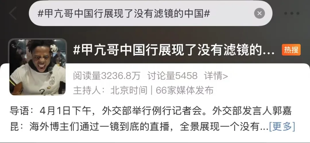 对于“甲亢哥”中国行,一位美国博主说:“美国政府过去一年刚花了16亿美元抹黑中国,结果被一些个人网红在影响力上碾压了。他们只要亲自去中国走走直播起来,就让美国政府天价宣传打水漂了。”