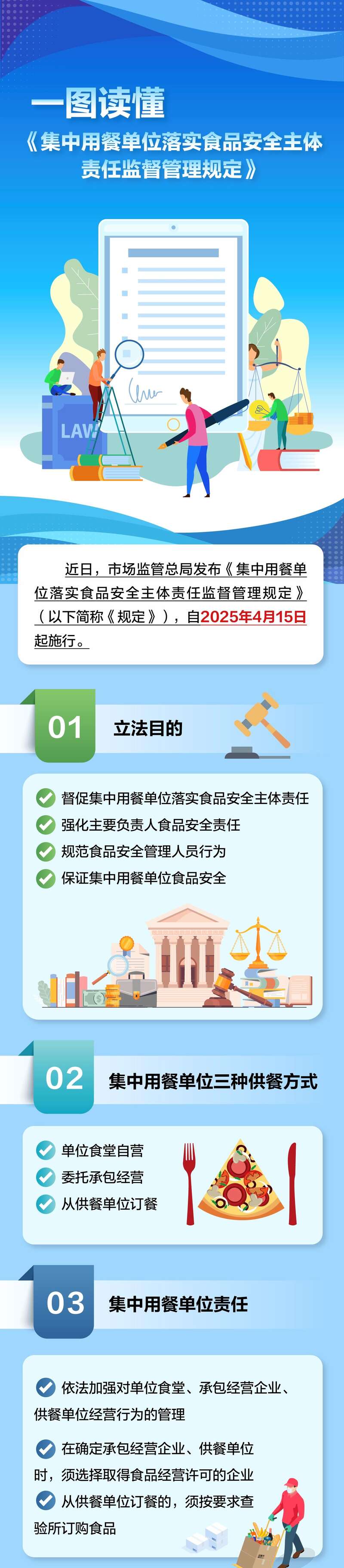 记者今天了解到,市场监管总局近日发布《集中用餐单位落实食品安全主体责任监督管理规定》,自2025年4月15日起施行。