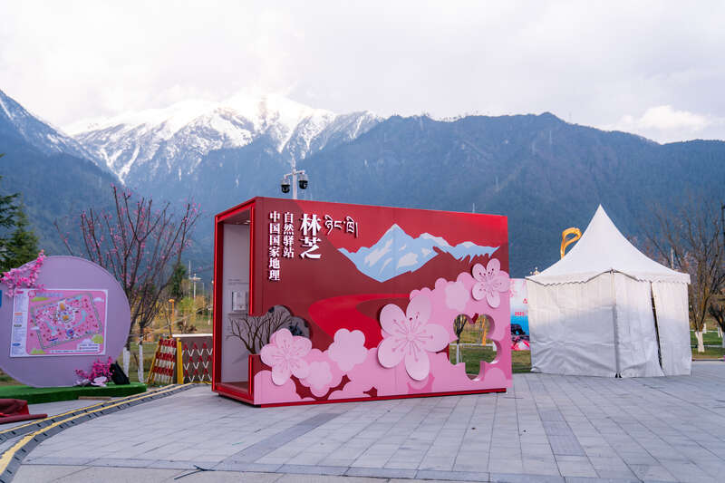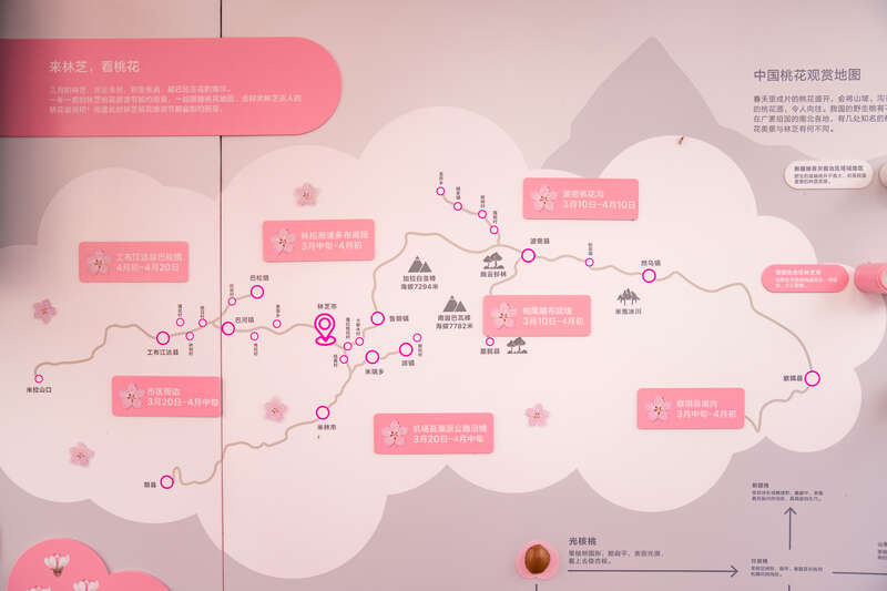 自然驿站内的背景板上绘有林芝桃花观赏地图和中国桃花观赏地图。林芝市区周边、工布江达巴松措、波密桃花沟、帕隆藏布沿线、察隅县……观赏桃花的景点、路段、村落以及开花时间均被清晰标注在地图上,引领游客探索林芝迷人的桃花盛景。