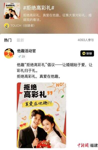 中新网福建新闻4月2日电 (杨伏山 蔡锦瑾)近年来,农村高额彩礼问题持续引发热议。如何有效遏制农村高额彩礼,已成为社会各界广泛关注的重要议题。响应国家号召,婚恋社交领军企业他趣3月底发起“拒绝高彩礼”线上线下公益活动,万人接力响应,助力婚俗新风尚建设。