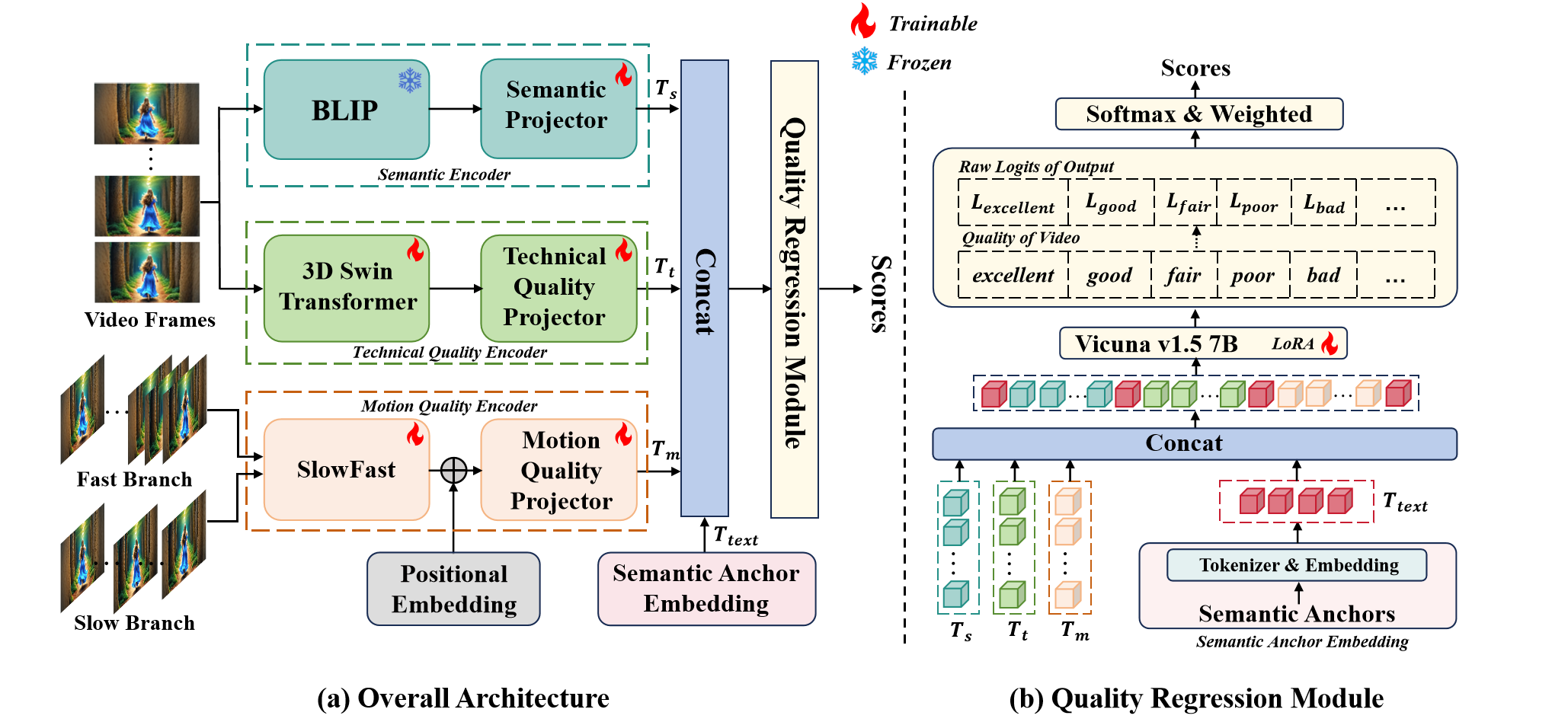 我校学生团队针对AI生成视频中常见的时空失真提出了多分支编码器架构,将视觉质量分解为技术质量、运动质量、语义内容三个维度,进行全面建模。团队设计了多模态提示词工程框架,将上述三类视觉特征对齐至语言空间,同时引入语义锚点,辅助大语言模型建立三类特征的关联推理。在训练阶段,采用LoRA微调技术对大语言模型进行任务定向微调,显著提升质量预测准确性。我校团队方案为本赛道中在测试集上与MOS分一致性超过60%的两个方案之一,展示了优秀的建模能力与实际性能。相关研究成果将以论文形式由CVPR 2025 Workshop发表。