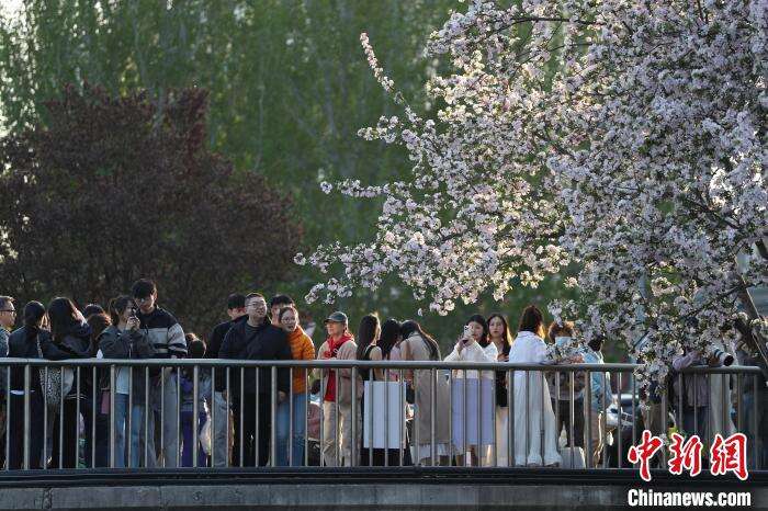 4月5日,北京望京盛开的海棠吸引众多游客拍照、游玩。中新社记者 王紫儒 摄