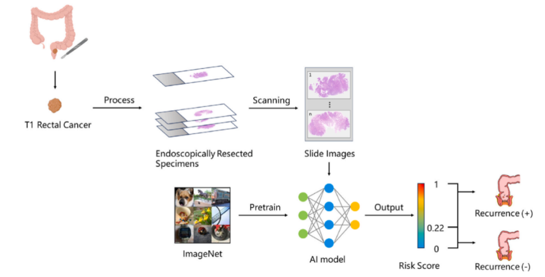 该成果基于内窥镜或经肛门手术切除的T1期结直肠癌标本的病理图像,研发了一种预测结直肠癌局部切除手术后复发风险的人工智能模型。该模型通过对肿瘤组织进行分析,可预测患者术后复发概率,从而辅助医生制定个性化治疗方案:对于高风险患者,建议追加手术,而低风险患者则可避免过度治疗。