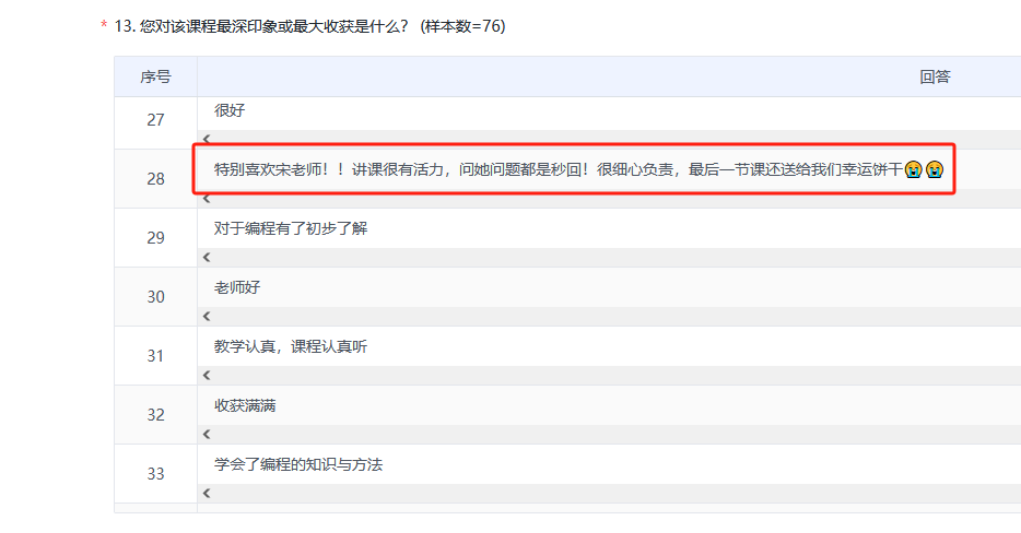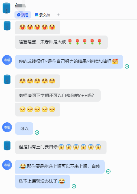课下飞书窗口永远在线,非本院学生也慕名抛出“疑难杂症”,每天收到的提问量堪比“三甲医院专家号”。期末,宋春瑶的课堂会随机掉落fortune cookie(幸运饼干),学生表示:“吃前记得备份代码,怕幸福到手抖。”