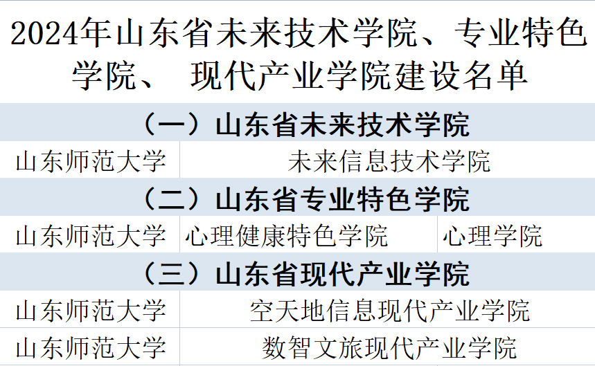 近日,山东省教育厅等5部门公布2024年山东省特色学院和拔尖创新人才培养组织实施高校名单。山东师范大学4个山东省特色学院和1个拔尖创新人才培养基地成功获批。其中未来信息技术学院获批山东省未来技术学院,心理健康特色学院获批山东省专业特色学院,空天地信息现代产业学院、数智文旅现代产业学院获批山东省现代产业学院,中国语言文学基础学科获批山东省基础学科拔尖学生培养基地。截至目前,学校共获批8个山东省特色学院、2个拔尖创新人才培养基地。