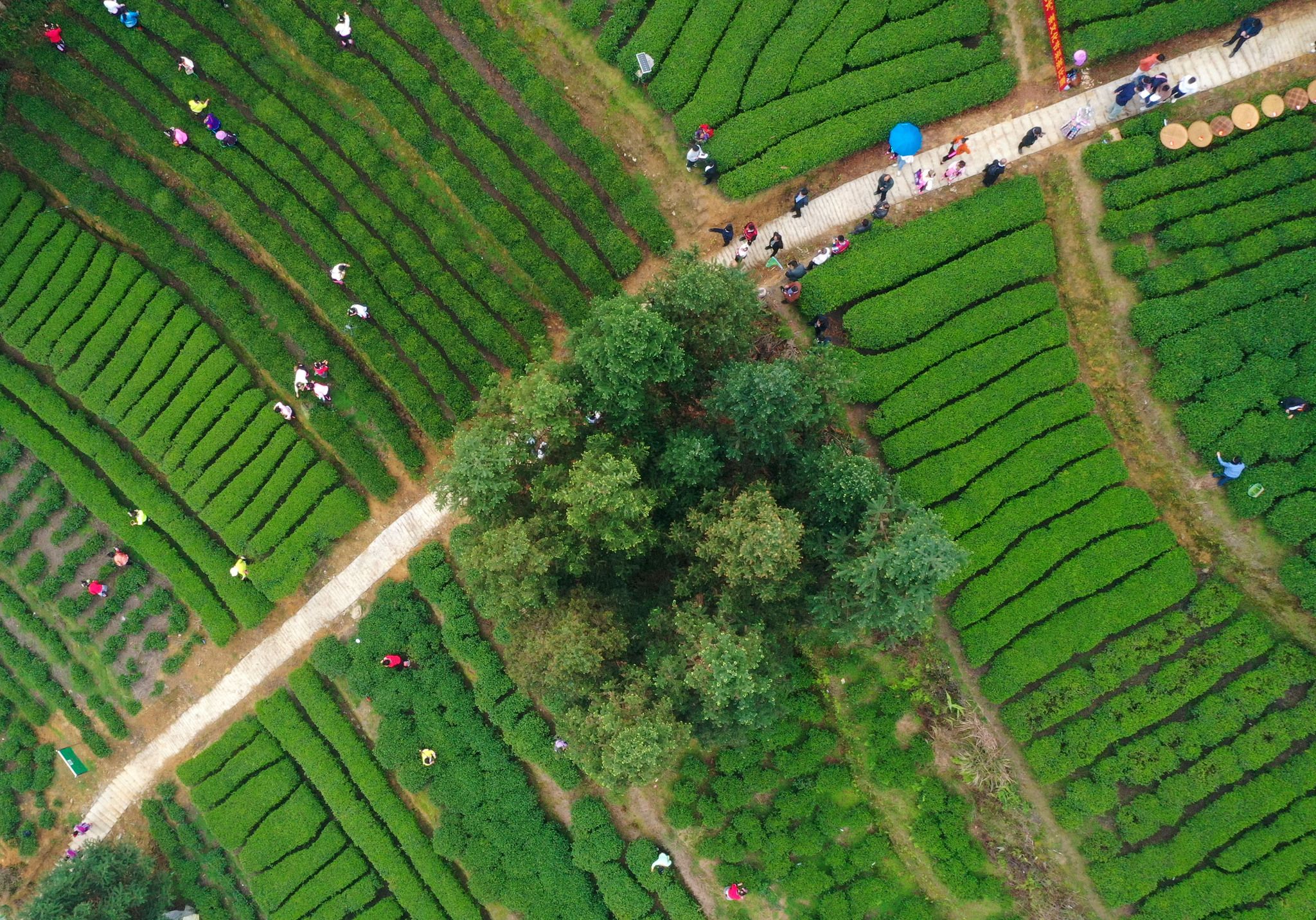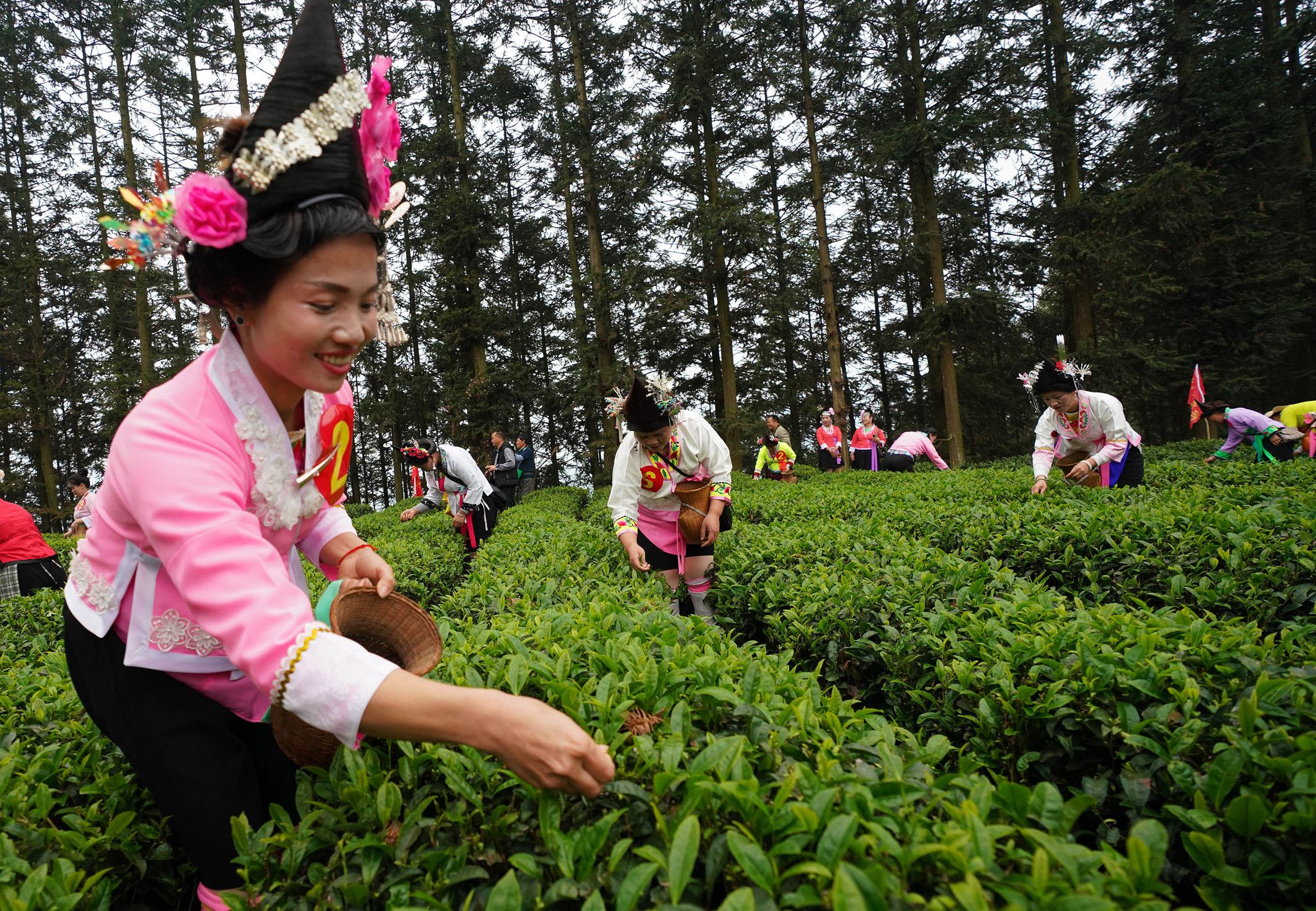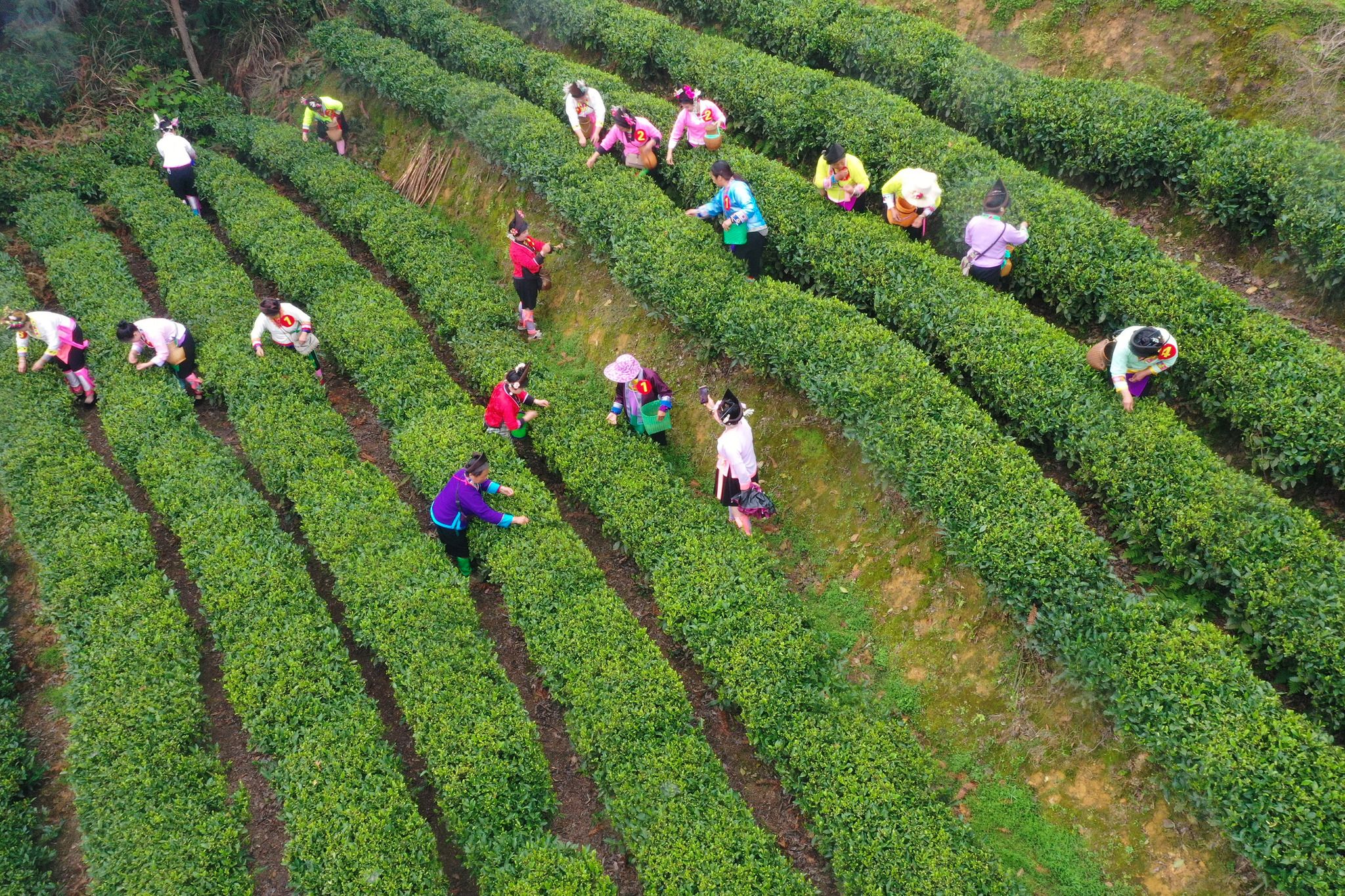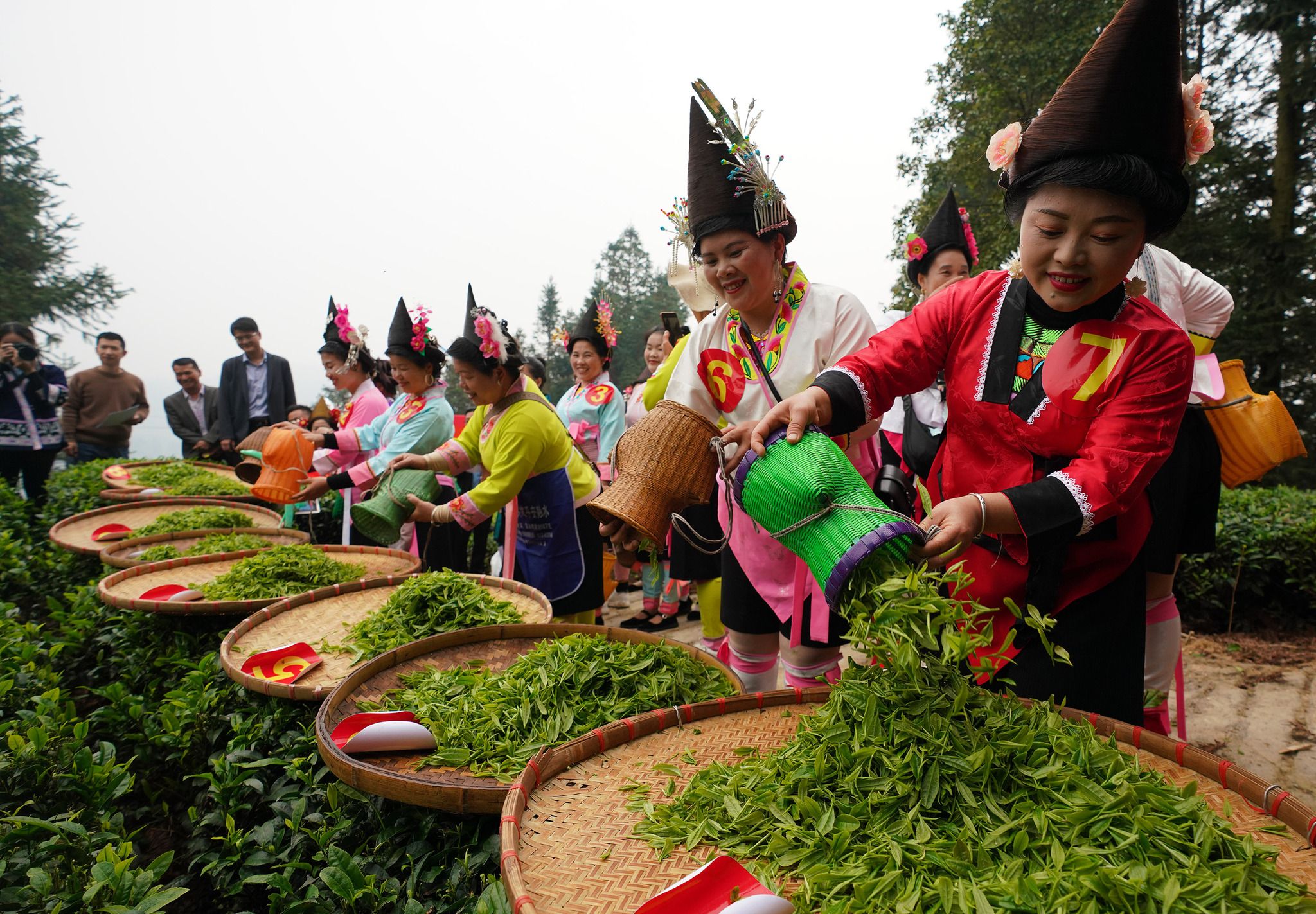 2025年4月8日,广西融水苗族自治县红水乡振民村茶园,村民正在进行春茶采摘比赛。