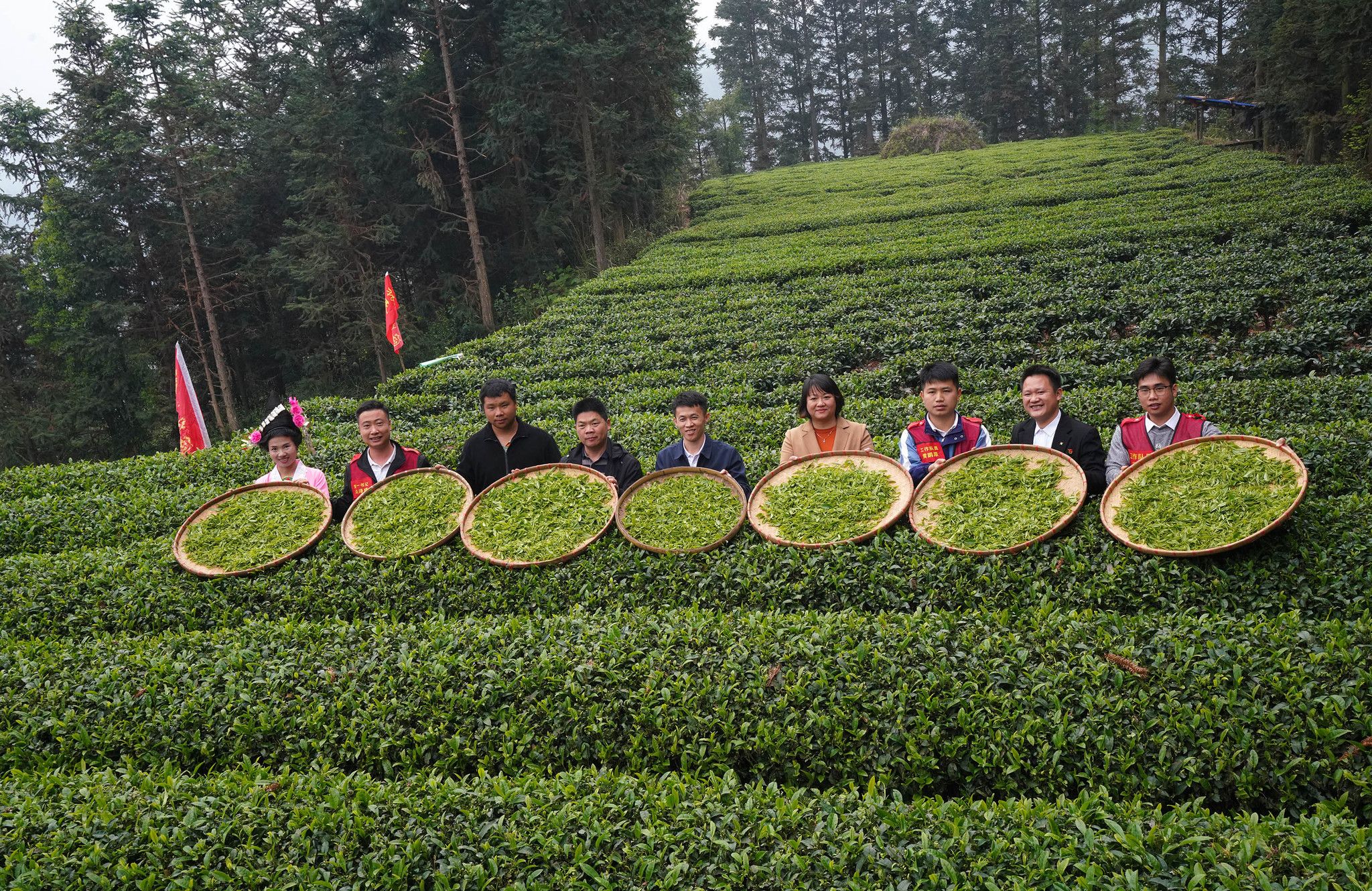 2025年4月8日,在广西融水苗族自治县红水乡振民村茶园,村民在展示刚采摘的春茶。