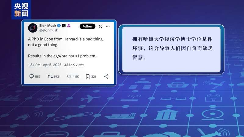 马斯克没有选择直接批评特朗普本人,但把火力集中到了新关税政策的重要推手之一纳瓦罗的身上。4月5日,马斯克在社交平台“X”上表示纳瓦罗拥有哈佛大学经济学博士学位是件坏事,这会导致人们因自负而缺乏智慧。