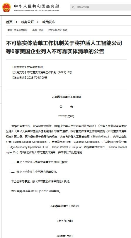 为维护国家主权、安全和发展利益,根据《中华人民共和国对外贸易法》《中华人民共和国国家安全法》《中华人民共和国反外国制裁法》等有关法律,不可靠实体清单工作机制依据《不可靠实体清单规定》第二条、第八条和第十条等有关规定,决定将护盾人工智能公司(Shield AI,Inc.)、内华达山脉公司(Sierra Nevada Corporation)、赛博勒克斯公司(Cyberlux Corporation)、边缘自治运营公司(Edge Autonomy Operations LLC)、Group W公司(Group W)和哈德森技术公司(Hudson Technologies Co.)等6家实体列入不可靠实体清单,并采取以下处理措施: