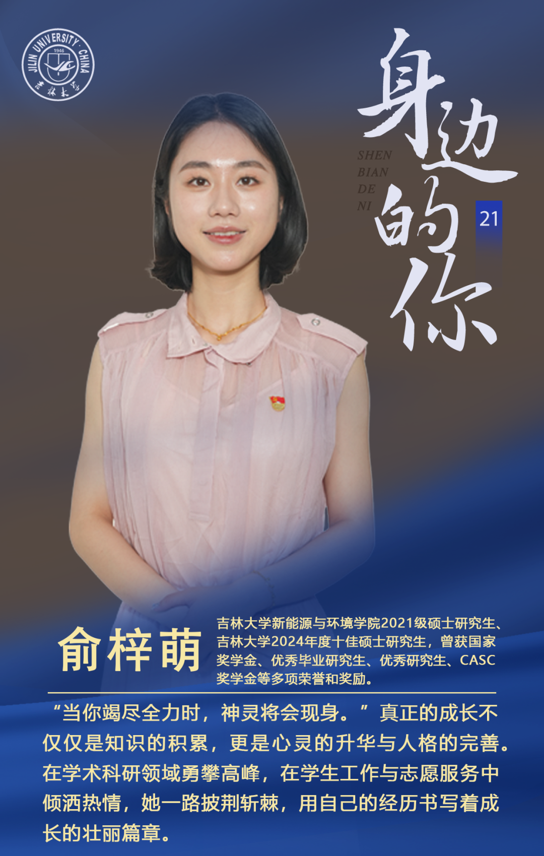 俞梓萌,吉林大学新能源与环境学院2021级硕士研究生、吉林大学2024年度十佳硕士研究生,曾获国家奖学金、优秀毕业研究生、优秀研究生、CASC奖学金等多项荣誉和奖励,发表SCI论文3篇,参与导师国家自然科学基金重大项目等各类科研课题3项。