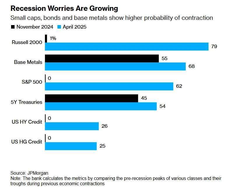 美国最大投行摩根大通4月8日表示,以小型股为主的罗素2000指数在近期的大跌中受到重创。该指数目前认为经济衰退的可能性为79%。而在去年11月份,美国大选刚刚尘埃落定之时,这一指数预测的衰退可能性只有1%。