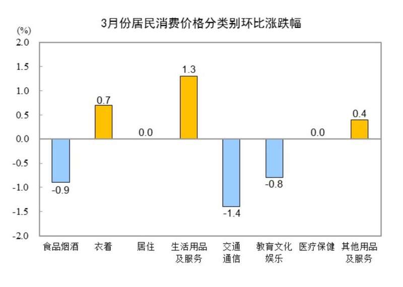 3月份,全国居民消费价格环比下降0.4%。其中,城市下降0.4%,农村下降0.3%;食品价格下降1.4%,非食品价格下降0.2%;消费品价格下降0.4%,服务价格下降0.4%。