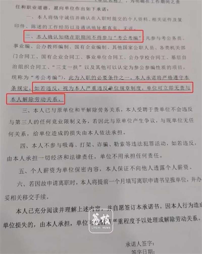 近日,安徽新锐教育集团旗下多所滁州学校教师反映,入职时被要求签订“不参加考公考编承诺书”。不仅如此,就在安徽滁州市公务员或者事业编考试当天,学校会对符合考试条件的教师挨个打电话,或拉工作群开视频会议,没有及时回消息的教师,会被认定为参加考公考编,将进行处罚并通报。