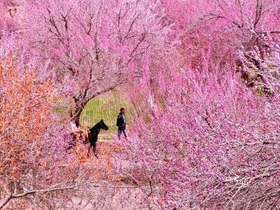 这是大自然独有的馈赠。这片广袤的土地上,孕育着壮观的杏树群落,更有14世纪遗留下来的原始野杏林。每年3月下旬,从吐鲁番盆地到帕米尔高原再到伊犁河谷,杏花次第开放。它耐旱、抗寒、不惧贫瘠,以顽强的生命力将根系深深扎进大地,绽放出明艳繁茂、纵情热烈的花朵。