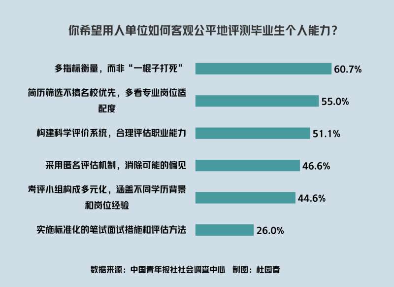 近日,中国青年报社社会调查中心联合问卷网(wenjuan.com),对1333名应届毕业生进行的一项调查显示,60.7%的受访应届生呼吁用人单位多指标衡量求职者能力。