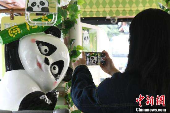 车厢内的大熊猫装饰物吸引乘客拍照留念。