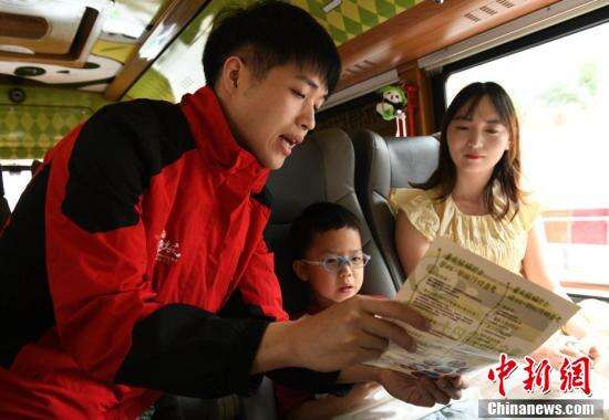 熊猫巴士讲解员向乘客介绍旅游线路。