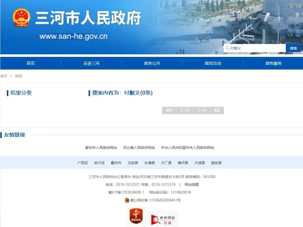 15日下午5时许,三河市政府官网“三河市委书记付顺义简历”网页已撤下,无法打开。
