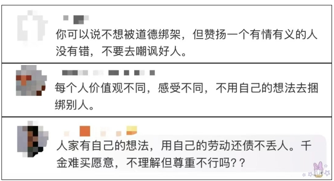 回看王婷还债的过程,她并不是盲目牺牲,没苦硬吃,而是通过勤俭奋斗、创业打拼的方式增加收入,她返乡发展特色农业,打造集种植、旅游、住宿、餐饮于一体的乡村研学基地,解决了近100人的就业问题,她用自己的努力弥补了爱人的遗憾,实现了事业理想,造福桑梓回馈社会,绽放出了属于女性的温润光芒,这与那些所谓的“遭遇情感勒索”“自苦式付出”有着本质区别......我们不能一边高喊打破对女性的“道德绑架”,一边对女性的个人选择吹毛求疵,制造新的“道德枷锁”,否定一切情感表达。