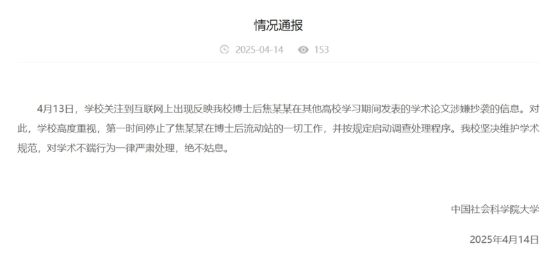 2025年4月14日,中国社会科学院大学发布情况通报称,4月13日,学校关注到互联网上出现反映我校博士后焦某某在其他高校学习期间发表的学术论文涉嫌抄袭的信息。对此,学校高度重视,第一时间停止了焦某某在博士后流动站的一切工作,并按规定启动调查处理程序。我校坚决维护学术规范,对学术不端行为一律严肃处理,绝不姑息。