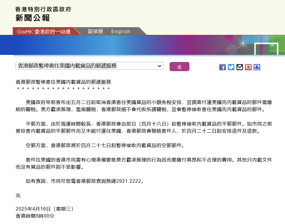 平邮方面,由于海运时间较长,香港邮政会由即日(四月十六日)起暂停接收内载货品的平邮邮件。如市民之前曾投寄内载货品的平邮邮件而又未能付运往美国,香港邮政会联络寄件人,于四月二十二日起安排退件及退款。