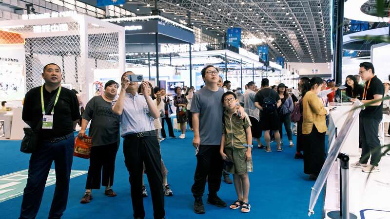 在“陆地航母”分体式飞行汽车展台前驻足的观众。胡思晗//摄