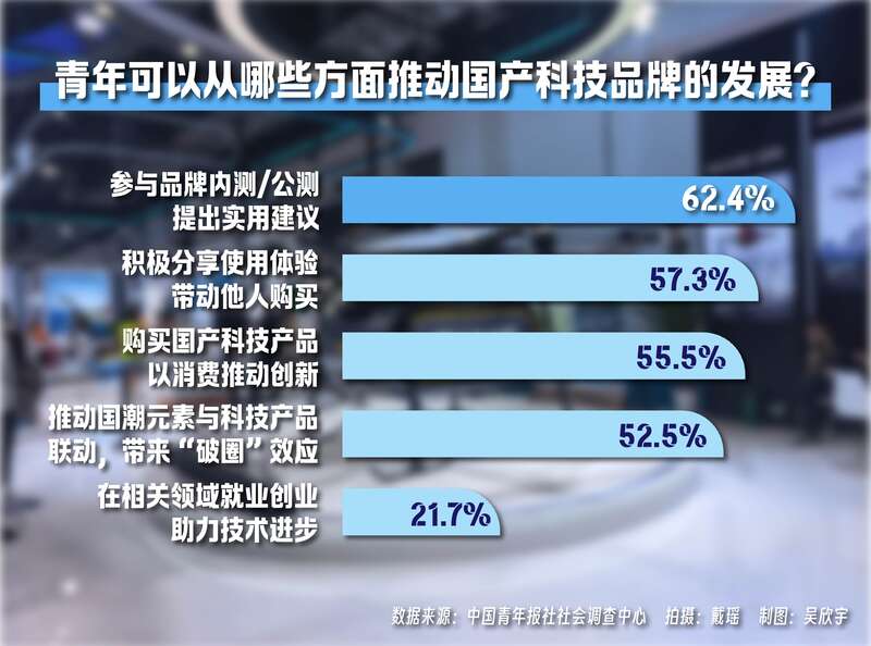 青年可以从哪些方面助力国产科技品牌创新发展?数据显示,超五成(55.5%)受访者认为可以通过消费推动国产科技品牌创新发展,62.4%的受访者认为可以参与品牌内测/公测,提出实用性的建议;57.3%的受访者认为可以积极分享使用体验,带动他人购买。其他还有:推动国潮元素与科技产品联动,带来“破圈”效应(52.5%);在相关领域就业创业,助力技术进步(21.7%)。